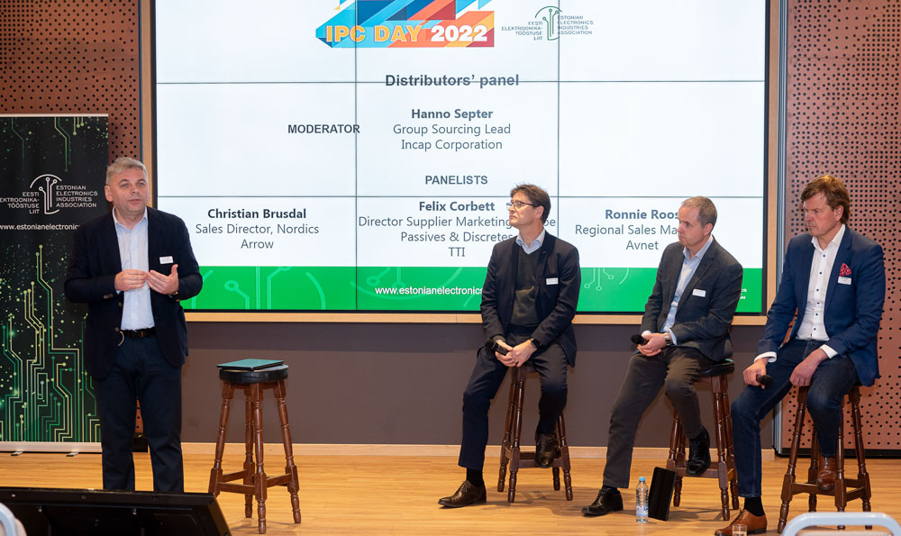 The Distributors' panel was moderated by Hanno Septer accompanied by panelists Christian Brusdal of Nordics Arrow, Felix Corbett of TTI, and Ronnie Roos of Avret. (Photo: Estonian Electronics Industries Association.)